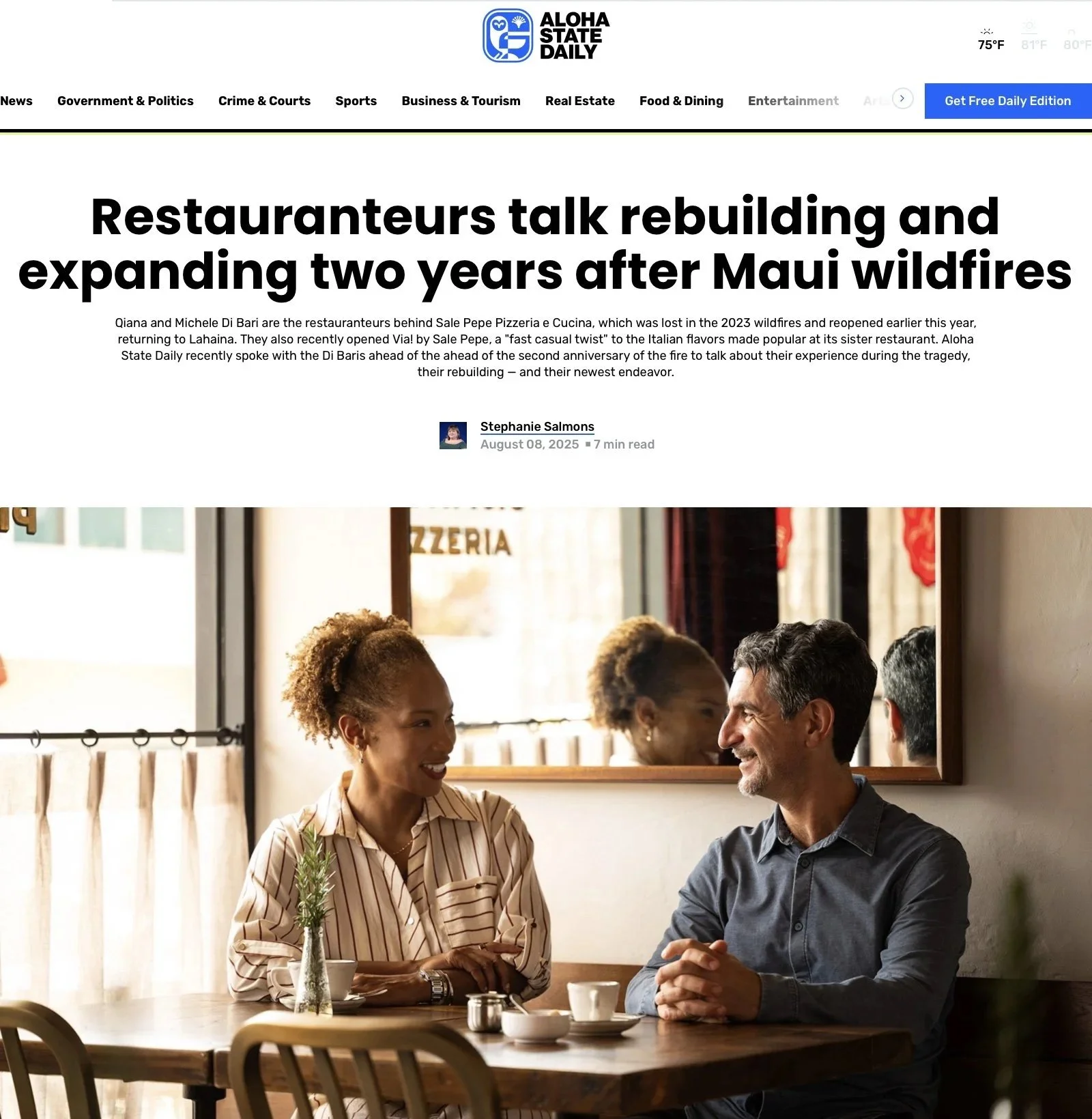 Qiana and Michele Di Bari are the restauranteurs behind Sale Pepe Pizzeria e Cucina, which was lost in the 2023 wildfires and reopened earlier this year, returning to Lahaina. They also recently opened Via! by Sale Pepe, a "fast casual twist" to the Italian flavors made popular at its sister restaurant. Aloha State Daily recently spoke with the Di Baris ahead of the ahead of the second anniversary of the fire to talk about their experience during the tragedy, their rebuilding — and their newest endeavor.